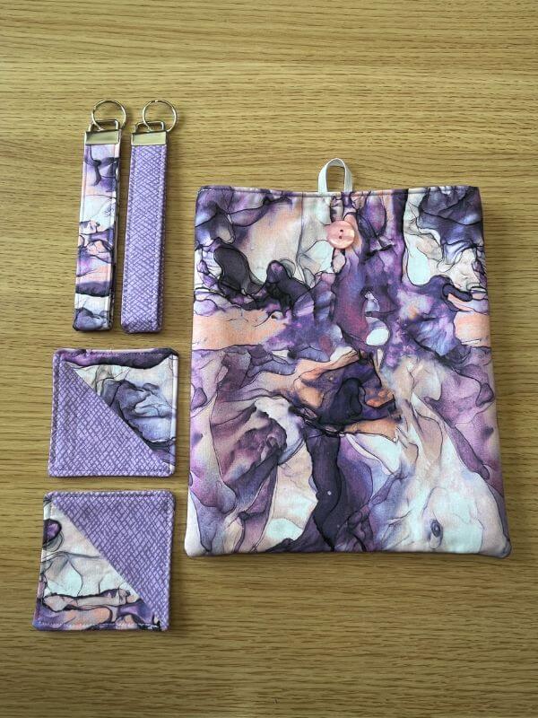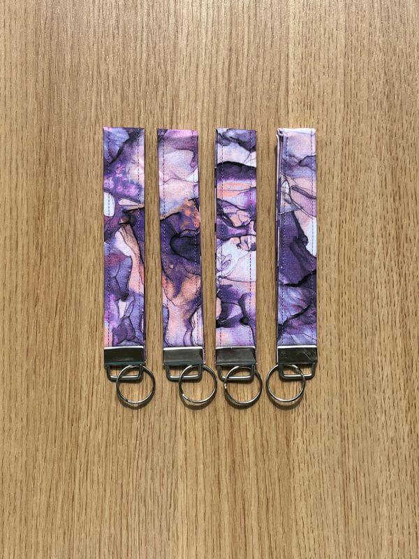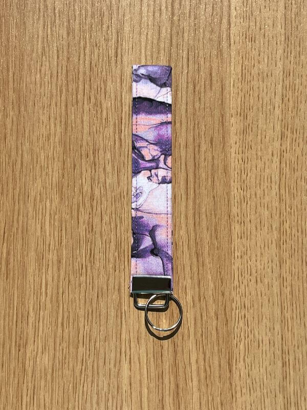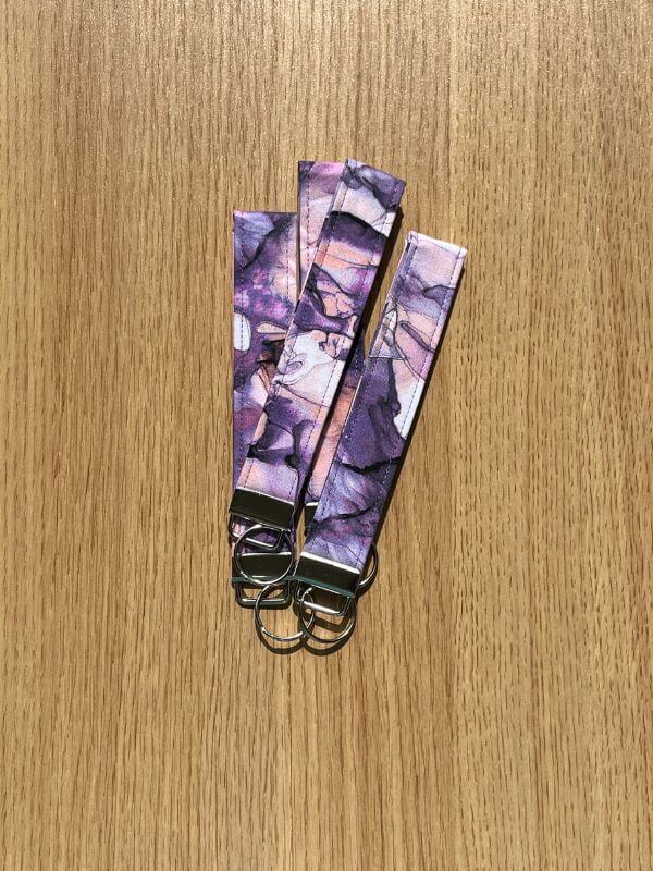 Embrace a dreamy swirl of color with this handmade fabric wristlet keychain, featuring soft purple and peach tones drifting across a white background. Crafted from lightweight cotton and finished with durable nickel hardware, it slips comfortably over your wrist — keeping your keys close by while adding a whimsical touch to your day.
