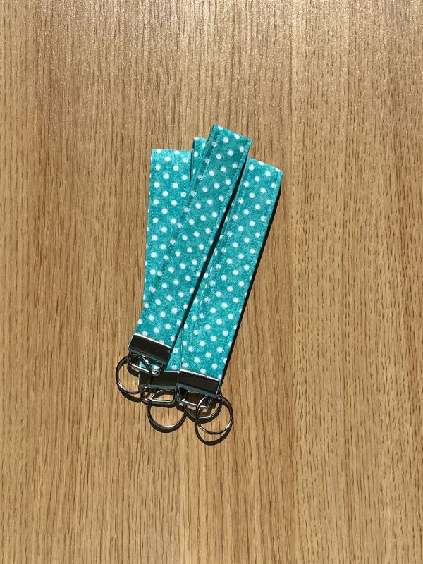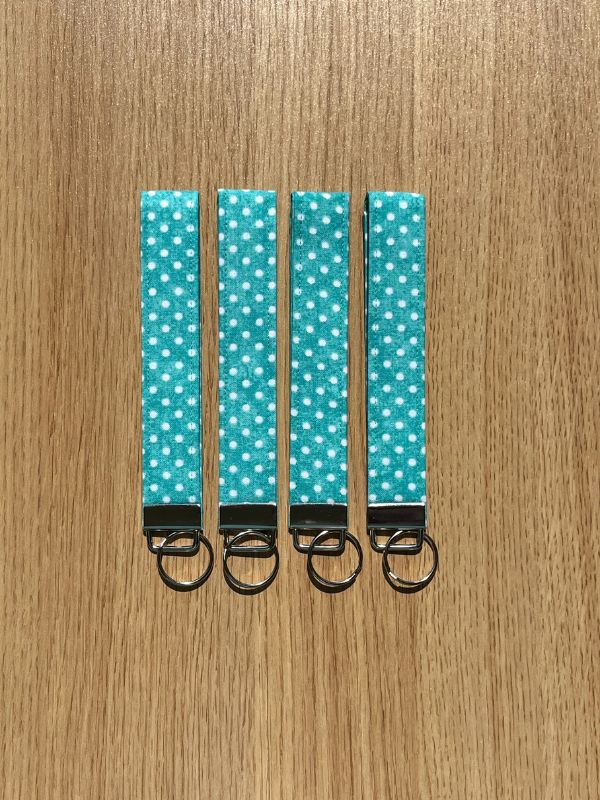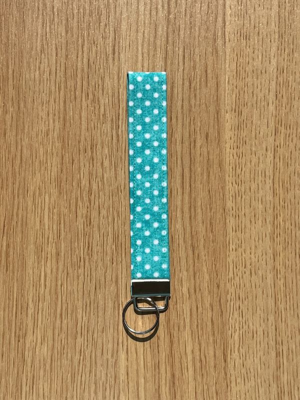Add a splash of playful charm to your day with this handmade fabric wristlet keychain, featuring bold white polka dots popping against a bright turquoise background. Lightweight and comfortable to wear, it slips easily over your wrist — keeping your keys close by so you can dash out the door without missing a beat.